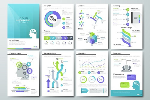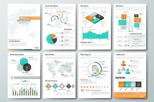 بروشور اینفوگرافیک فلت حرفهای حاوی اینفوگرافیک سبک فلت (Flat) بدون نقص است و به 4 بروشور( 8 صفحه به ازای هرکدام ، در مجموع 32 صفحه آماده استفاده) و 49 بسته آیکن در سبک خطی مدرن وجود دارد تقسیم میشوند. این مجموعه حاوی تعداد زیادی عناصر اینفوگرافیک است : نمودار دایرهای ، فرآیند روبان، پیکانها، نمودار بلوک ستونی، نمودار خطی، مفهوم کارتیمی، فرآیند فکر کردن در ردههای بالا، مفهوم رشد گراف پیکانی، تقاطع مستطیلی، قالب جهانی به همراه نمودار دایرهای، خط زمانی در سبکهای مختلف، اینفوگرافیک کارتیمی، مفهوم بازاریابی، نمودار پیتزایی، نمودار مدور، قالب درخت راهحل، تقاطع سطحدایرهای، نمودار میلهای، نقشه جهانی، لیست برنامهریزی، مفهوم ایده لامپ روشن، تحلیل swot، قالب روبان، گامهای دایرهای، نمودار مارپیچ، دستگاهها، فرآیند مستطیلی و موارد بیشتر میباشد. وکتور. میتوان به عنوان طراحی وب، خط زمانی و لیاوت جریانکاری از آن استفاده کرد. به منظور رسیدن به حداکثر ویرایش از Adobe Illustrator استفاده کنید. فایلهای PSD با برنامه Illustrator ساخته شده است و حاوی آبجکتهای راستر میباشد.