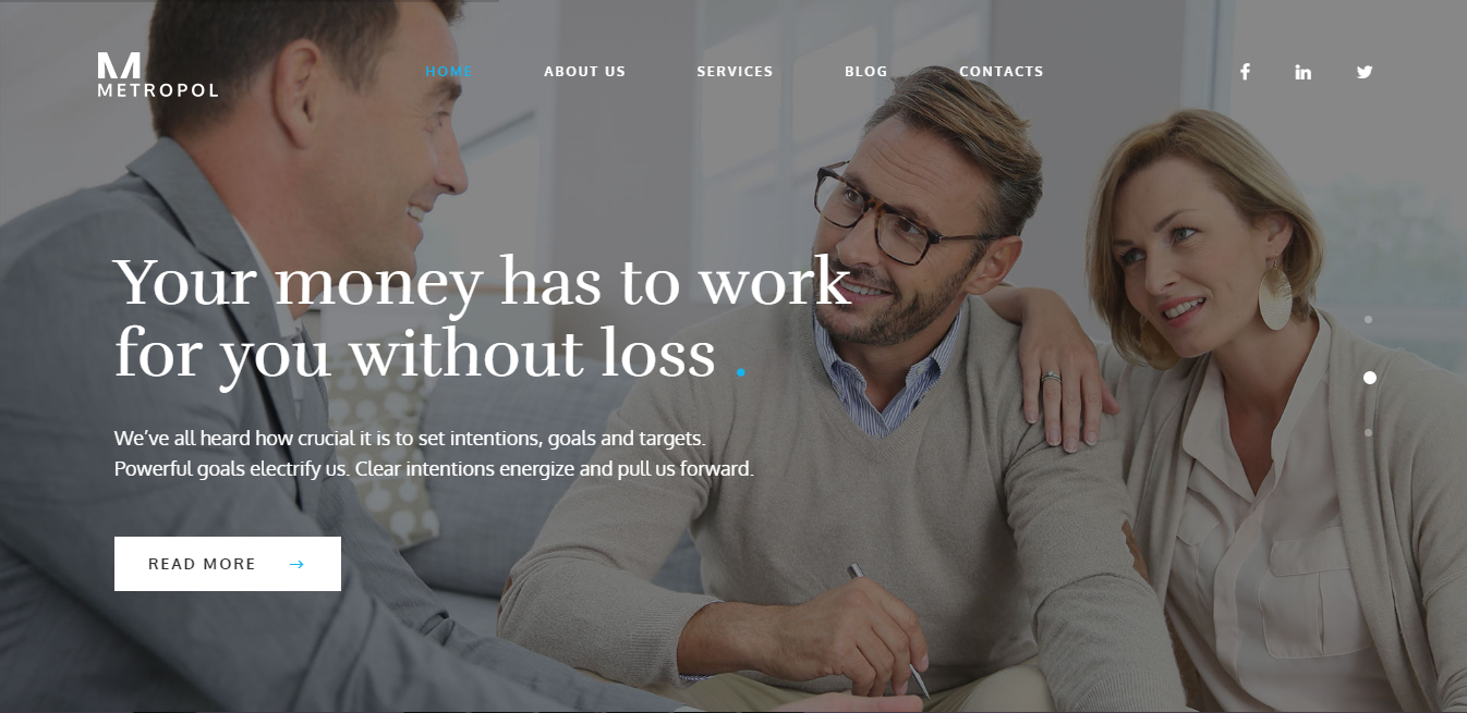 Metropol یک قالب HTML بی‌نقص، شرکتی و مدرن است. شما می‌توانید از آن برای سرمایه‌گذاری، امور مالی، کسب و کار و سایر وب سایت‌های شرکتی استفاده کنید. قالب در دو رنگ آبی و سبز طراحی شده است. شما می‌توانید هر کدام را که دوست دارید انتخاب کنید.
