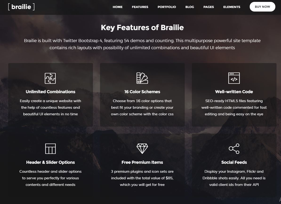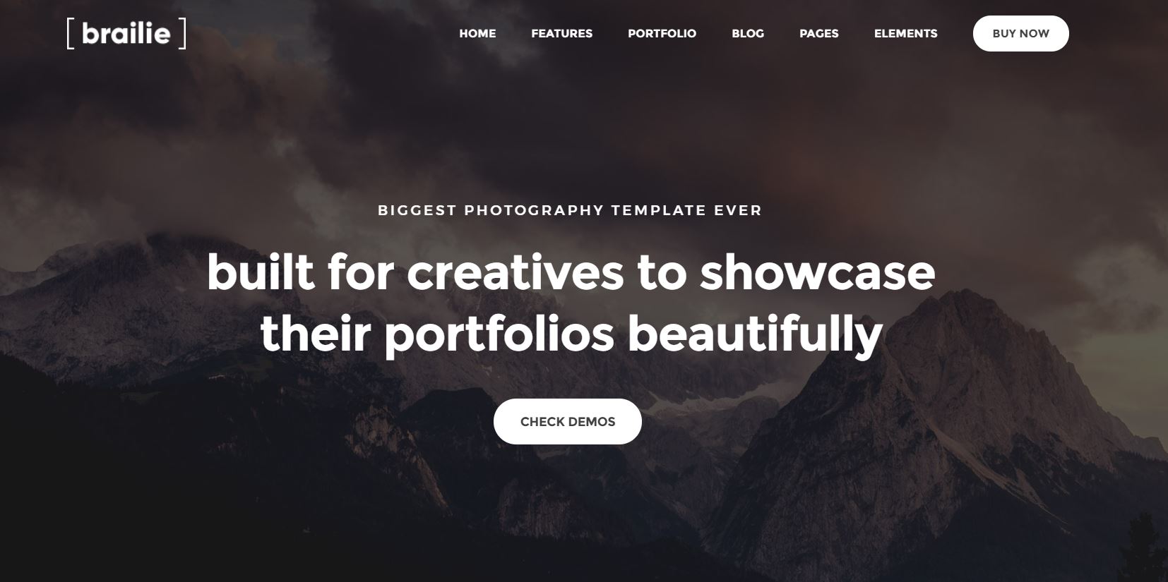 Brailie بزرگترین قالب عکاسی با آپشن‌های مختلف نمونه‌کار و وبلاگ است که برای عکاسان، استودیوهای دیجیتالی و فریلنسرهایی که مایلند نمونه‌کار خود را به زیبایی نمایش دهند و وبلاگ­‌نویسانی که به دنبال داشتن مجلات جذاب هستند، مناسب است. Brailie با بوت‌استرپ 4 ساخته شده است و تعداد زیادی از صفحات HTML5 جذاب با بیش از 50 دموی مختلف، 16 رنگ و 6 نوع فونت، آپشن طراحی تک‌صفحه‌­ای و همچنین آپشن‌­های نمونه‌کار، وبلاگ، هدر و اسلایدر بی‌شماری دارد. شما می­‌توانید یک وب­­‌سایت منحصر به فرد با استفاده از ویژگی‌­های قدرتمند Brailie ایجاد کنید که ویژگی‌­های طراحی برای عکاسی در زمینه‌های مراسم عروسی، غذا، رویداد، مد، زندگی، طبیعت و تجارت را دارد.