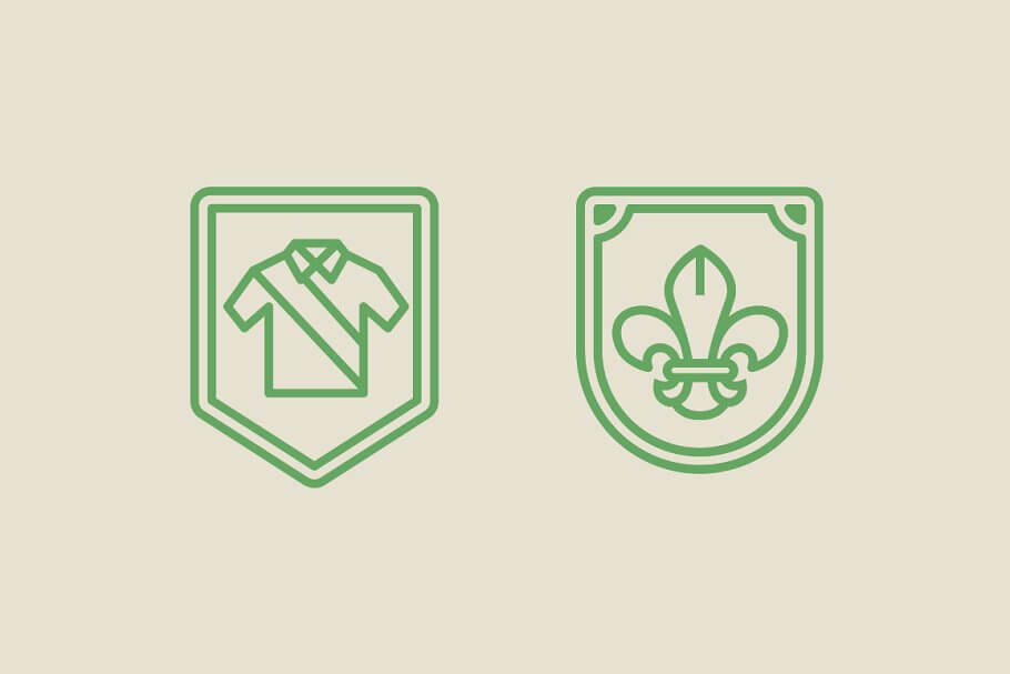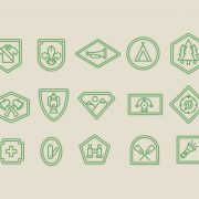 مجموعه ای ساده و شیک از آیکون‌های نشان دیده‌بانی. شامل علامت های چادر، جنگل، تبر، غنیمت، کوه ها، قلم خودنویس، قطب نما، نماد کمک های اولیه، چاقوی کوچک جیبی، مشعل، شیپور، پیراهن و تابارد، دوربین‌ شکاری، پارو و غیره است.