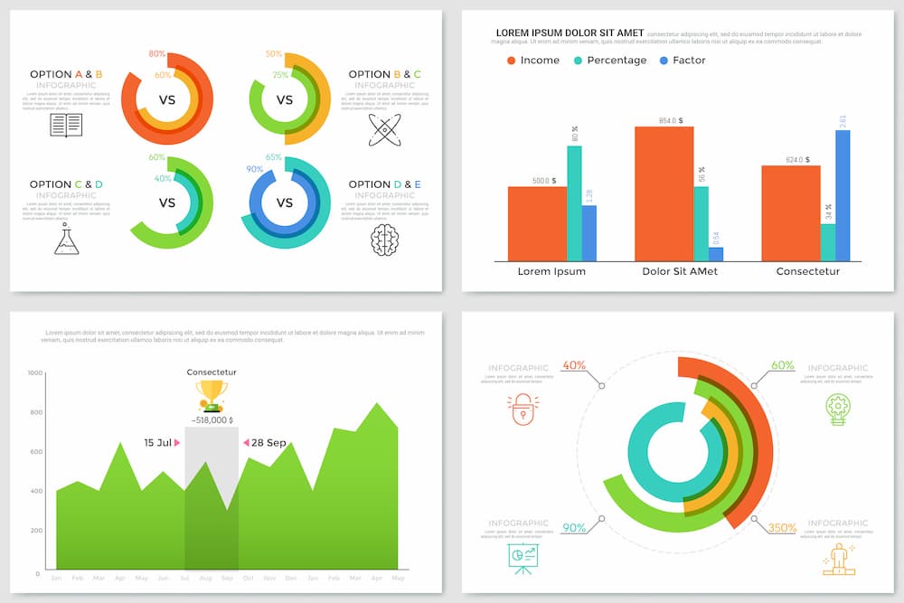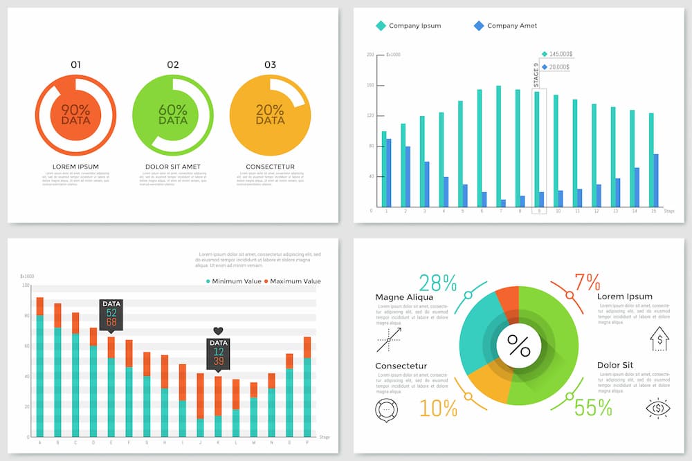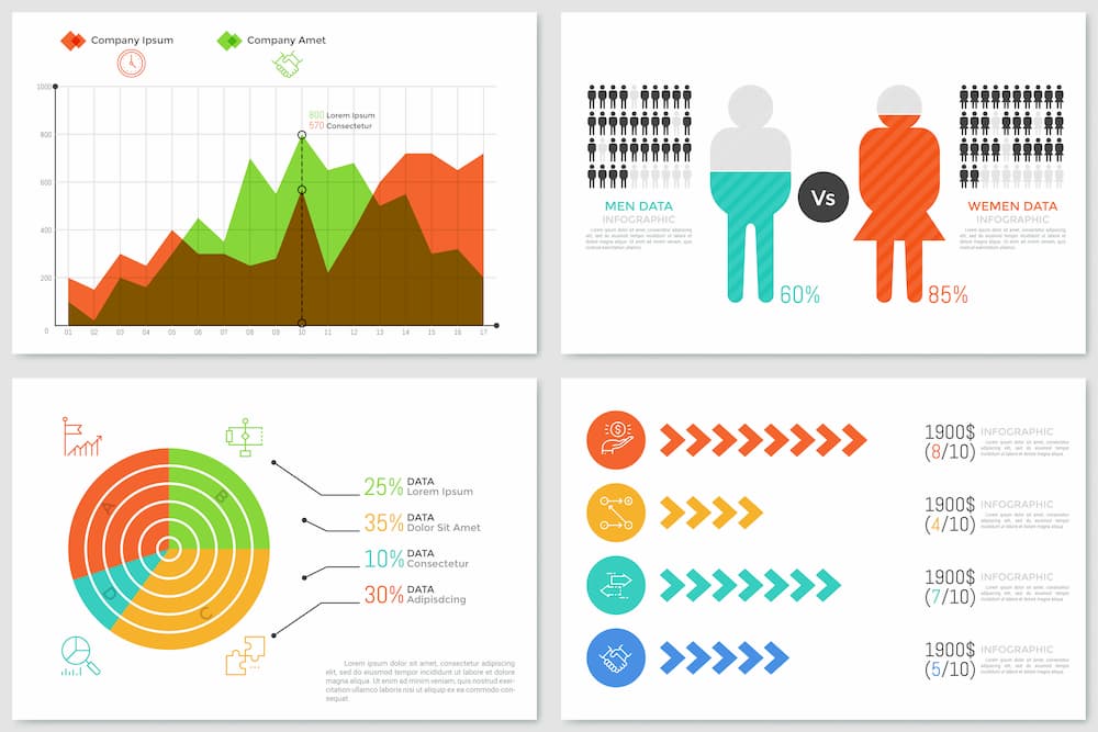 Infographic Live Charts v.2 شامل 20 live graph (ساخته شده از طریق ابزار گراف) می باشد. نمودار دایره ای شفاف، نمودار ستونی شفاف، نمودارهای خطی، مقایسه مردان نسبت به زنان، نمودار پراکندگی، نمودارهای میله ای، نمودارهای منطقه ای، نمودار تجمعی، نمودار هرمی و نمودار میله ای همراه فلش تکرار. 100 % بصورت نموداری. از این مجموعه می توان در طراحی وب، قالب های چاپ، عناصر به سبک سازمانی، توسعه برنامه های کاربردی و بازی ها، طرح گردش کار، قالب های فرآیند، جدول زمانی و … استفاده کرد.