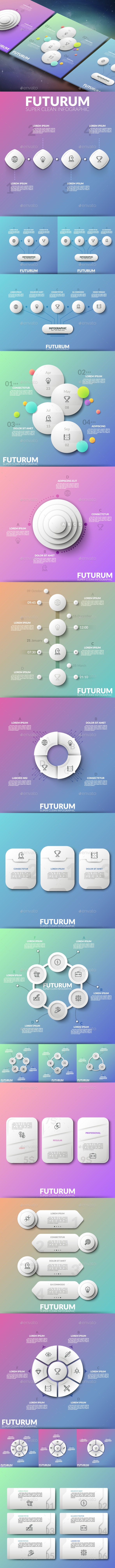 White Futurum Infographic includes templates made in futuristic style, absolute clean and absolute white shapes. It looks absolutely attractive and modern! This elements will perfectly create a focus points on every colorful background. With this pach You will be able to create cool presentations, print material, web elements or shapes for apps.