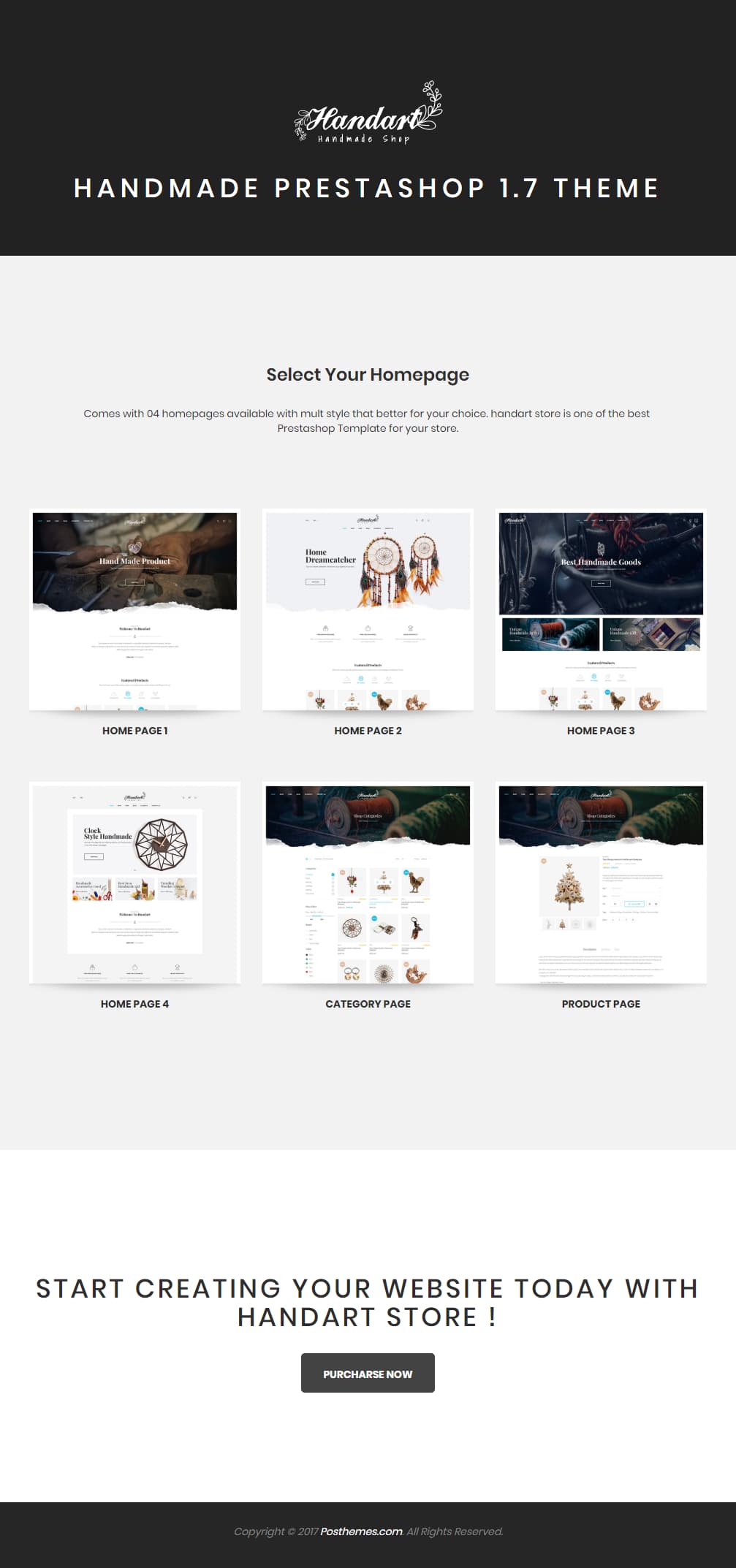 Handart Responsive Prestashop 1.7 theme offers you an online store to sell handmade products and other goods with innovative design and powerful features.