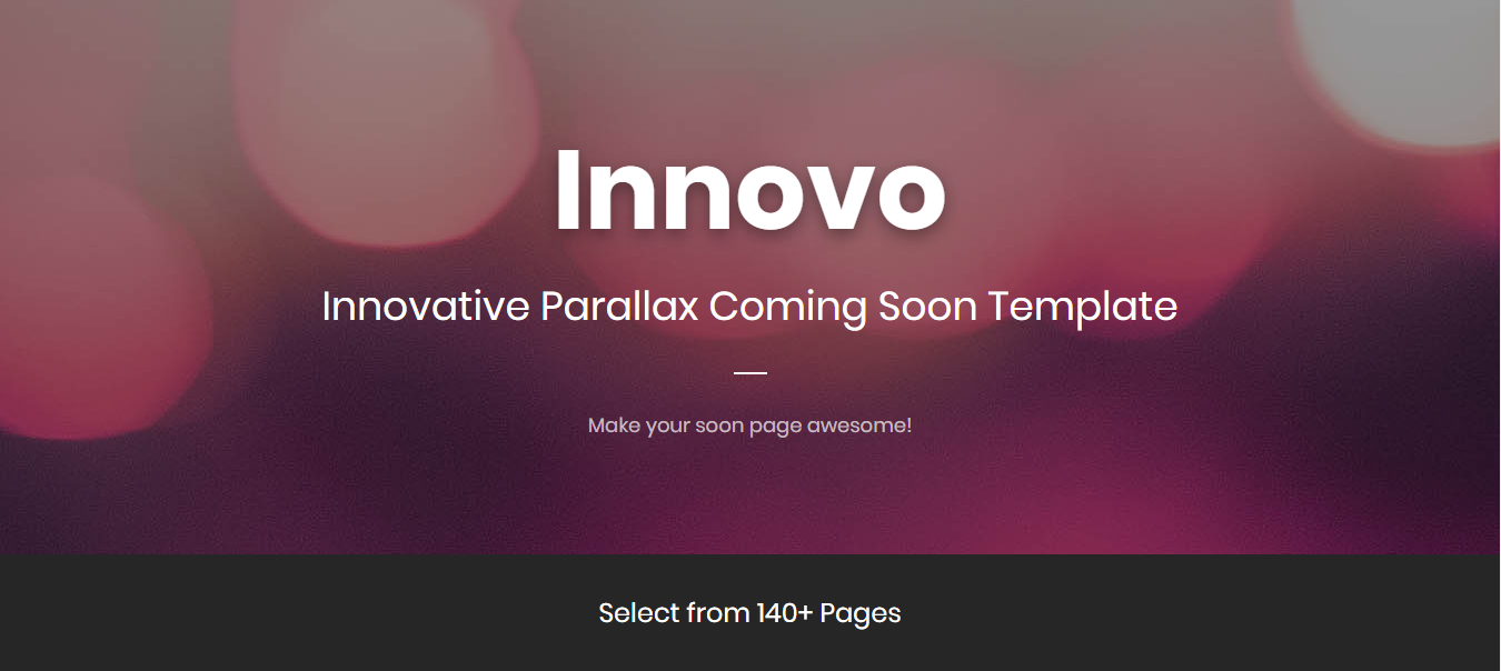 Innovo is innovative and creative coming soon template for every creative person, agency, e-commerce, portfolio etc. It brings 16 different pages in 3 variants – Parallax variant, Static text and Parallax background and Default version. Each in 3 version – Count down, Subscribe input form and Simple text. So it’s 144 pages!. Innovo is ready for MailChimp forms and has working contact and input forms…